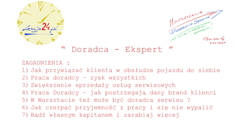 Kurs jest zbiorem wiedzy która jest niezbędna do właściwej obsługi klienta dzięki czemu będą zachowane właściwe standardy obsługi zarówno w Warsztatach jak i Autoryzowanych stacjach obsługi . Dzięki zachowaniu standardu obsługi i sposobów na lepszą komunikację z klientem zwiększysz dzięki temu swoją pozycję jako zaangażowanego pracownika , polepszysz relacje z klientami a przede wszystkim zarobisz więcej dla swojej firmy i Siebie.